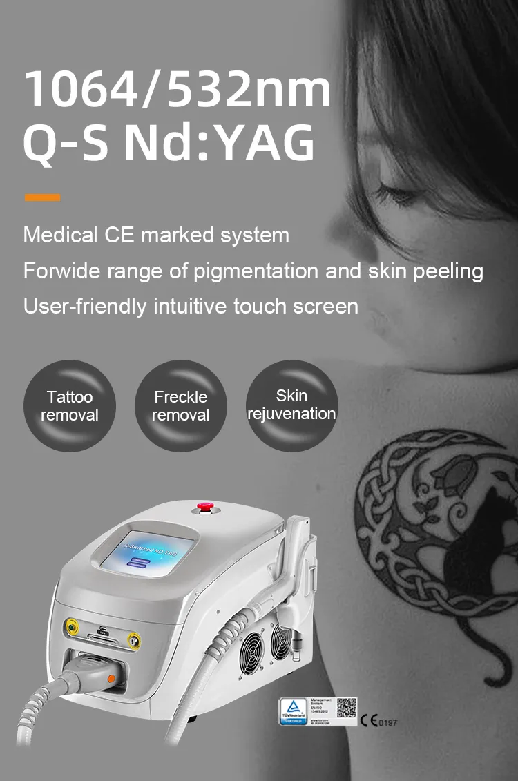 The Special Wavelength of 532/ 1064 ya laser can penetrate skin of human body according to the theory and practice of ” Selective Laser Decomposing”, the instrument uses the laser-wave to break Chromatophoreinto pieces which can be naturally absorbed by the body. So that it achieves the purpose of de-freckling. The 1064nm wavelength will shatters and removes the black and blue pigments while the 532nm wavelength will shatters and removes red, pink, purple and brown pigments of the tattoo or other pigmenations without damaging the normal tissue.