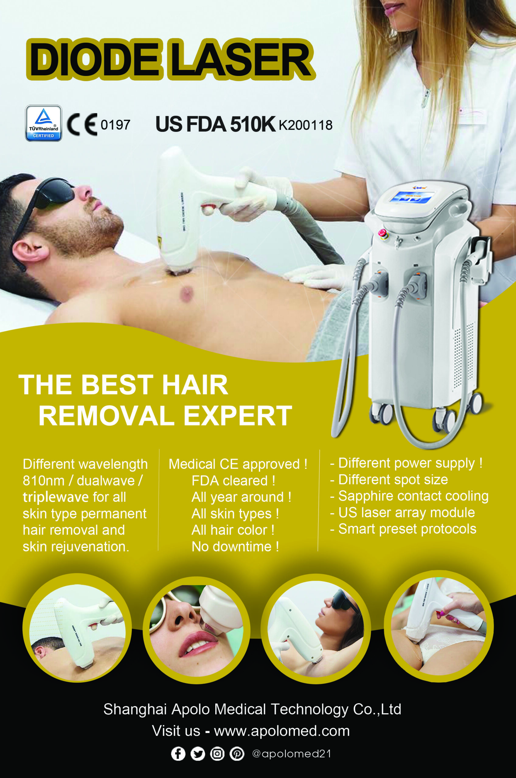 Established in 2001, Shanghai Apolo Medical Technology Co., Ltd. Is with rich experience in the development, engineering and marketing of IPL, RF, body slimming beauty systems, micro’dermabrasion equipment, and a broad array of aesthetic laser such as: diode laser, Q-Switched ND Yag laser, erbium Yag, erbium glass and long pulse ND Yag laser etc.. Our products are used to provide a diverse range of treatment applications such as hair removal, skin rejuvenation, deep wrinkle removal, pigmentation removal, acne treatment, vascular treatment, scar reduction, sculpture, body slimming, tattoo removal and so on. Apolo equipments strictly in accordance with I S O 1 3 4 8 5. All our products are complied with Beauty CE and Medical CE certificate. Our top-end products had obtained F D A 5 1 0 K, Australia TGA, Brazil An’visa and many other different certificates. We have a strong distribution and channel network in more than 40 countries around the world such as in Europe, North America, South America, Southeast Asia, and Middle East. We aspire to keep growing and continue open to partners who are interested to grow with us and to add values to both parties. We commit to continuously transform ourselves to stay relevant as a market leader and engineered our products to provide the best value to our Partners and customers. Welcome to stay beauty with Apolo and lighting your life through technology.