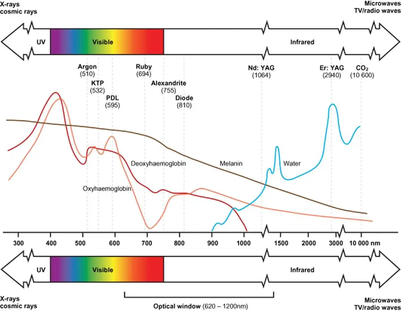 The Fitzpatrick Skin Type Scale is a vital tool used in dermatology and medical aesthetics to categorize how various skin tones respond to light, heat, and UV exposure. Developed to predict a person’s likelihood of burning or tanning, it has become equally valuable in determining how safely and effectively different skin types can be treated with lasers. Because lasers target pigment—either in the skin, hair, or underlying tissue—knowing the Fitzpatrick category is crucial to selecting appropriate wavelengths, adjusting energy levels, and reducing the risk of pigmentation issues or burns. There are six different Fitzpatrick skin types, ranging from white/pale skin to dark brown. Characteristics of Type I are that the skin always burns but minimally tans, while the darker Type VI never burns but can tan easily due to its deep pigmentation. Melanin is a chromophore, meaning it absorbs wavelengths of light. The more melanin in the skin means the more energy it absorbs, which increases the risk of overheating and pigment changes such as burns. For darker skin types, Type IV, V, and VI, the interaction between wavelength and melanin is crucial. Shorter wavelengths, such as 632nm or 755nm, have high melanin absorption, too more laser energy can overheat the skin, leading to burns, blistering, or further pigmentation issues such as hyperpigmentation or hypopigmentation. This is why longer wavelengths are typically preferred, such as the 1064 Nd:YAG laser.